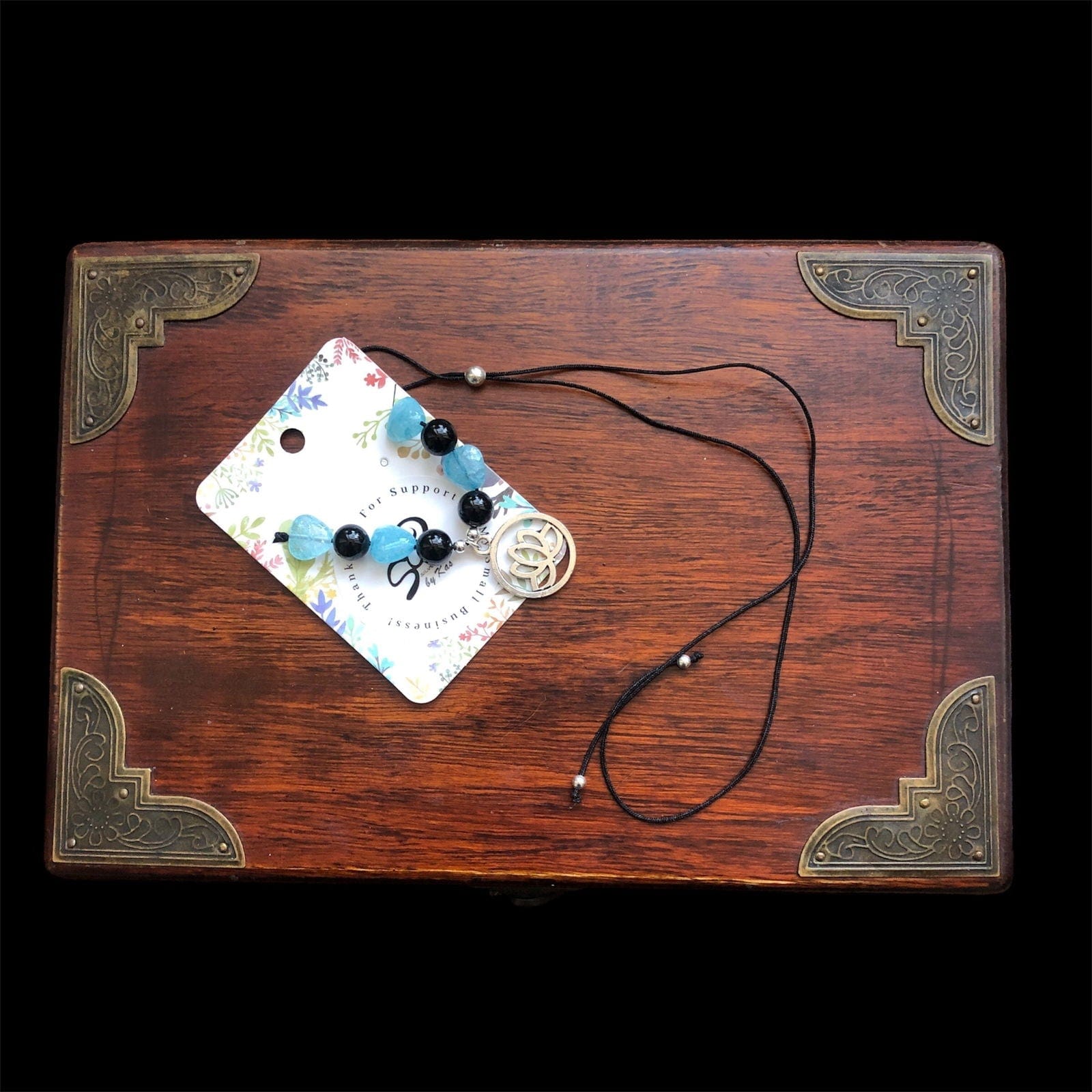 This handmade Black Thread Choker Necklace with Quartz and Onyx features beautiful blue quartz and black onyx beads, along with a delicate silver plated lotus flower charm. Its boho style adds a touch of elegance to any outfit. Bring a sense of balance and positivity with the healing properties of these gemstones.