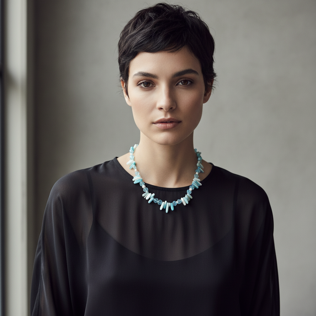 This stunning handmade beaded necklace features a combination of blue mother of pearl and quartz beads in various shapes, accented by white freshwater pearls. The 925 silver handcrafted clasp adds a touch of elegance and durability. Elevate any outfit with the natural, calming beauty of this unique Blue Mother of Pearl, Quartz and Freshwater Pearls Beaded Necklace.