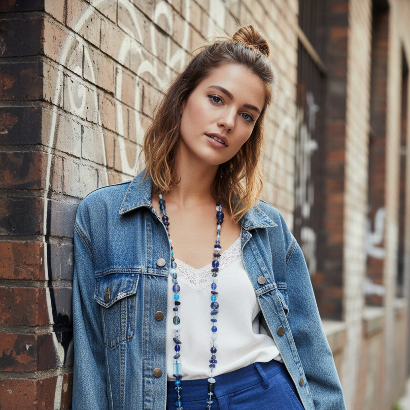Embrace your bohemian spirit with this handmade Blue Stones and Glass Beaded Long Necklace! Adorned with natural stones in shades of blue, including lapis lazuli, sodalite, aquamarine, and blue gold stone, this necklace is perfect for layering. The various shapes of blue glass beads add a unique touch to this bohemian style piece. Channel your inner free spirit with this stunning accessory.