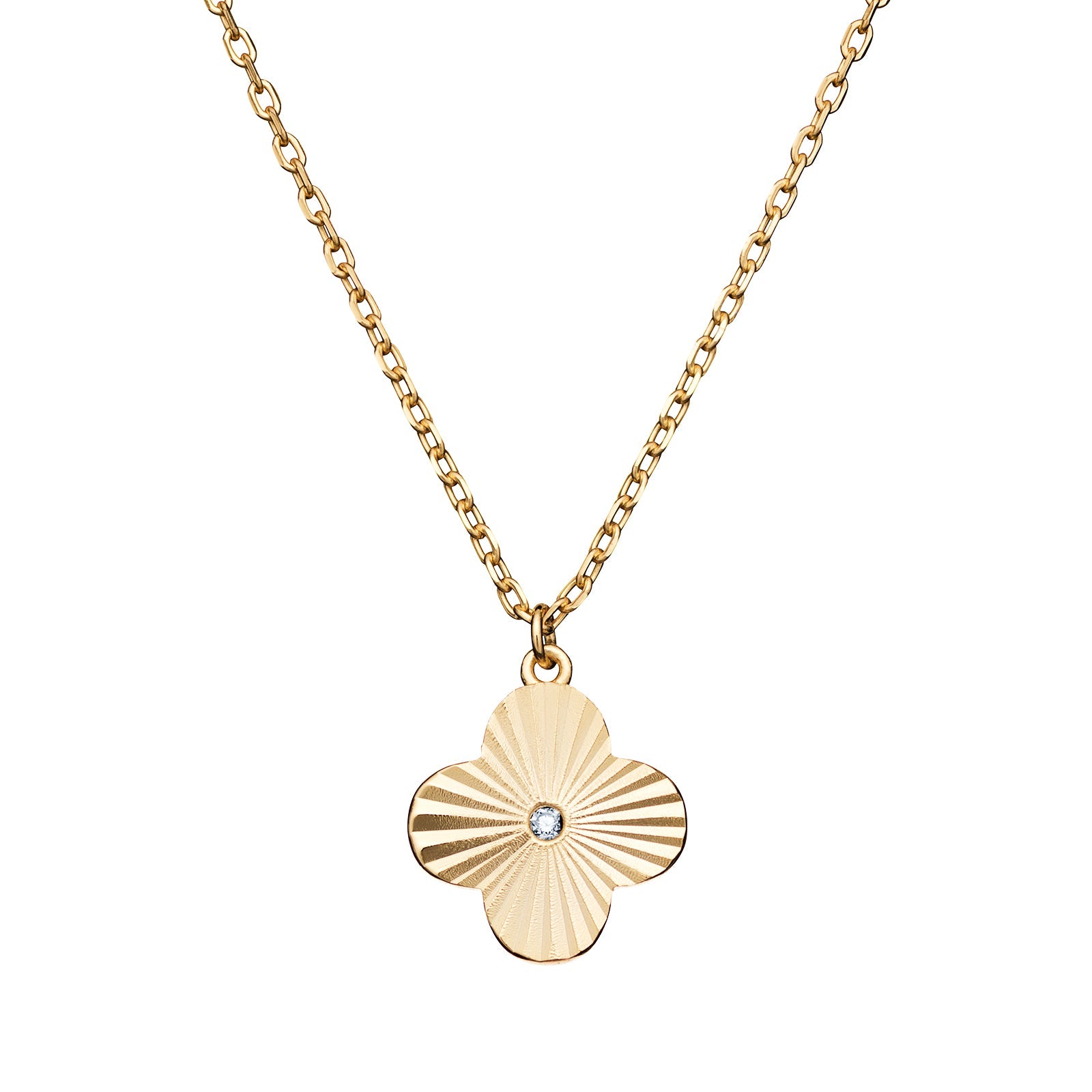 - Design: Clover sunburst pendant with central Cubic Zirconia accent