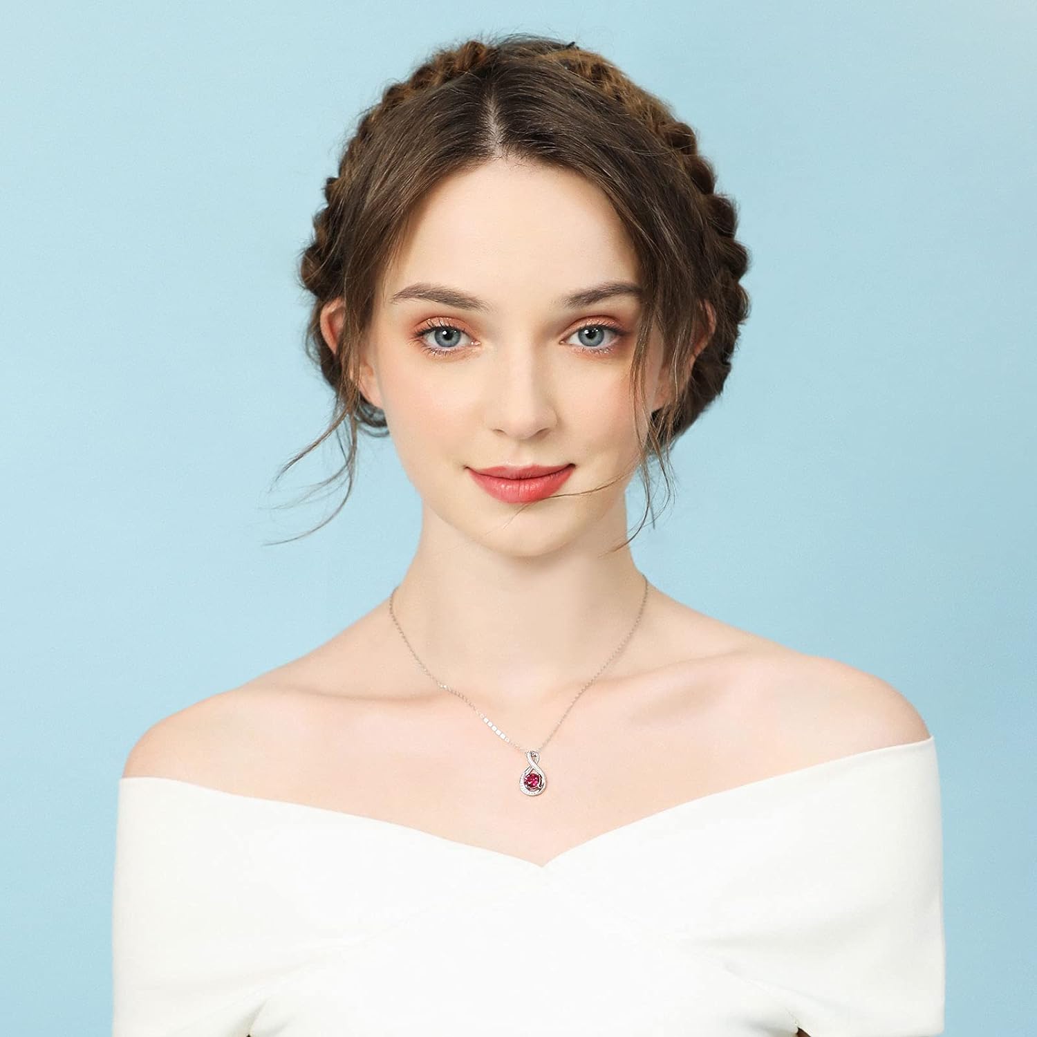 Our stunning July Birthstone Infinity Pendant Necklace are made from 925 sterling silver and adorned with clear and ruby red cubic zirconia.
