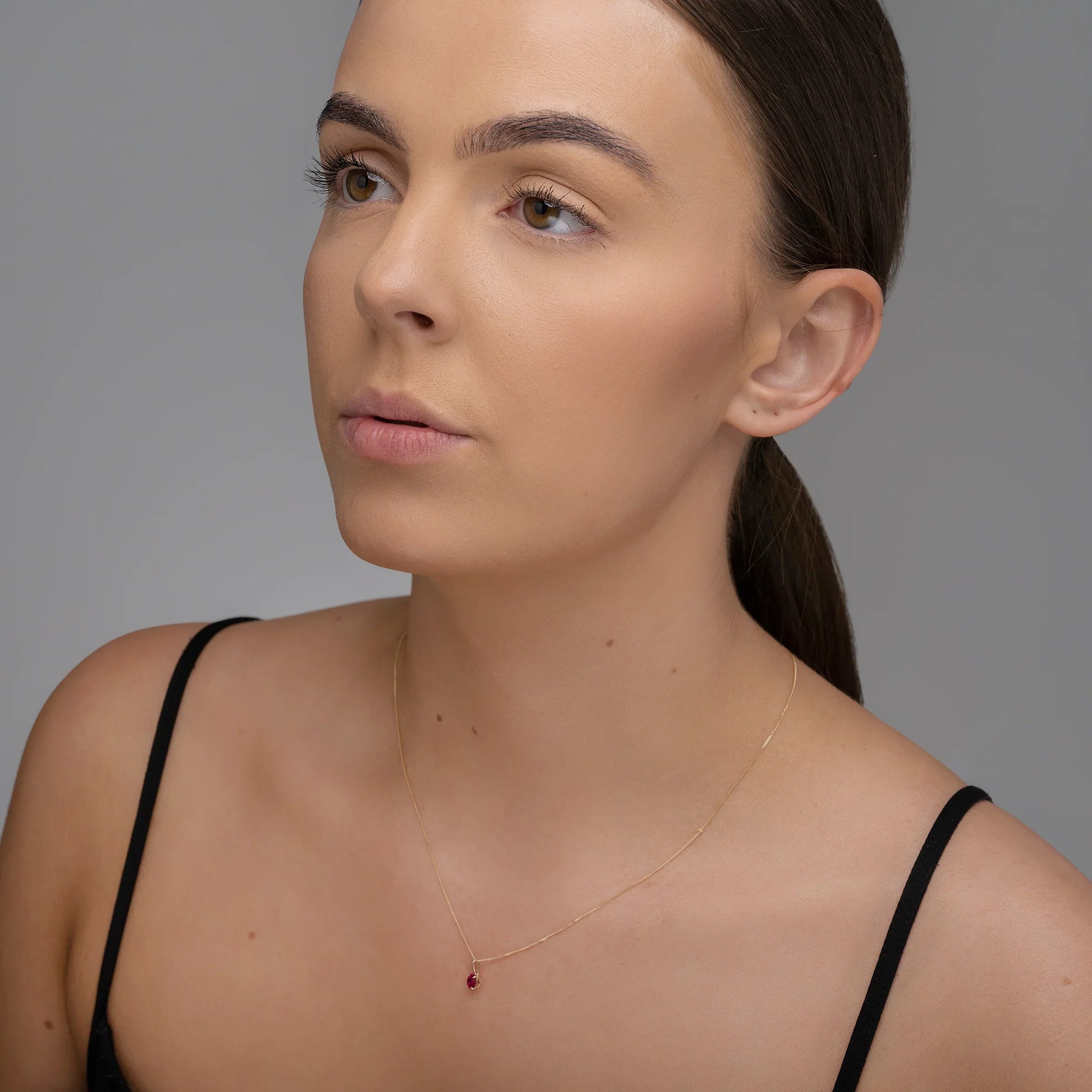 This July Birthstone - Ruby Pendant Necklace. The sparkling ruby cubic zirconia stone mimics the deep red hue of Ruby, set in a 9ct gold pendant. Presented on a 9ct gold curb chain.