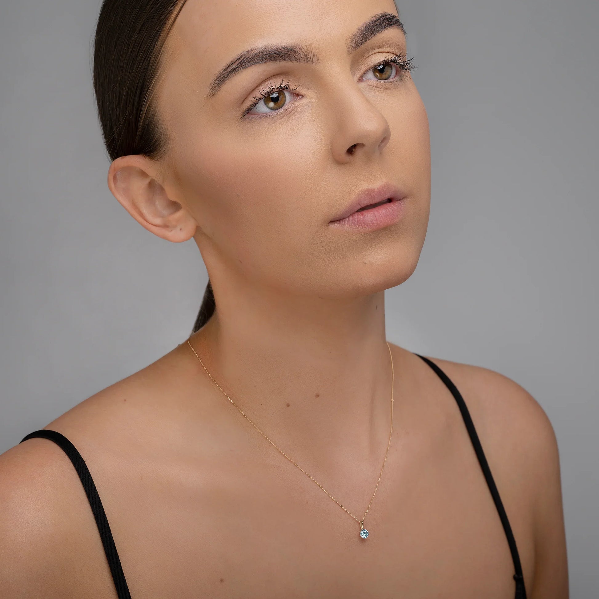 This March Birthstone - Aquarmarine Pendant Necklace. The sparkling cubic zirconia stone mimics the sea blue hue of aquarmarine, set in a 9ct gold pendant and chain.