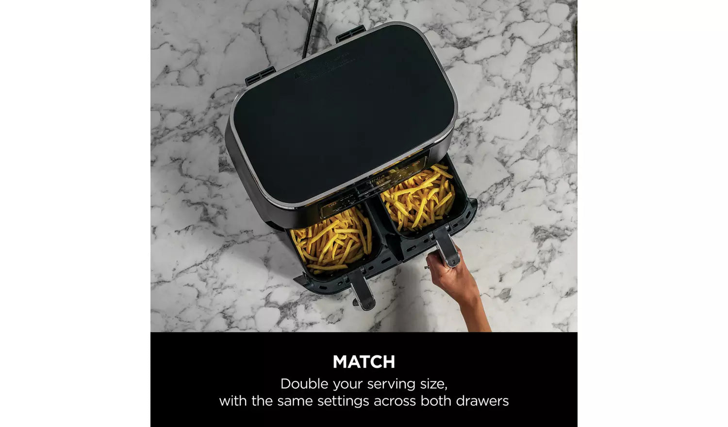 - Dual Zone Technology: Two independent 3.8L cooking zones let you cook mains and sides simultaneously with different settings