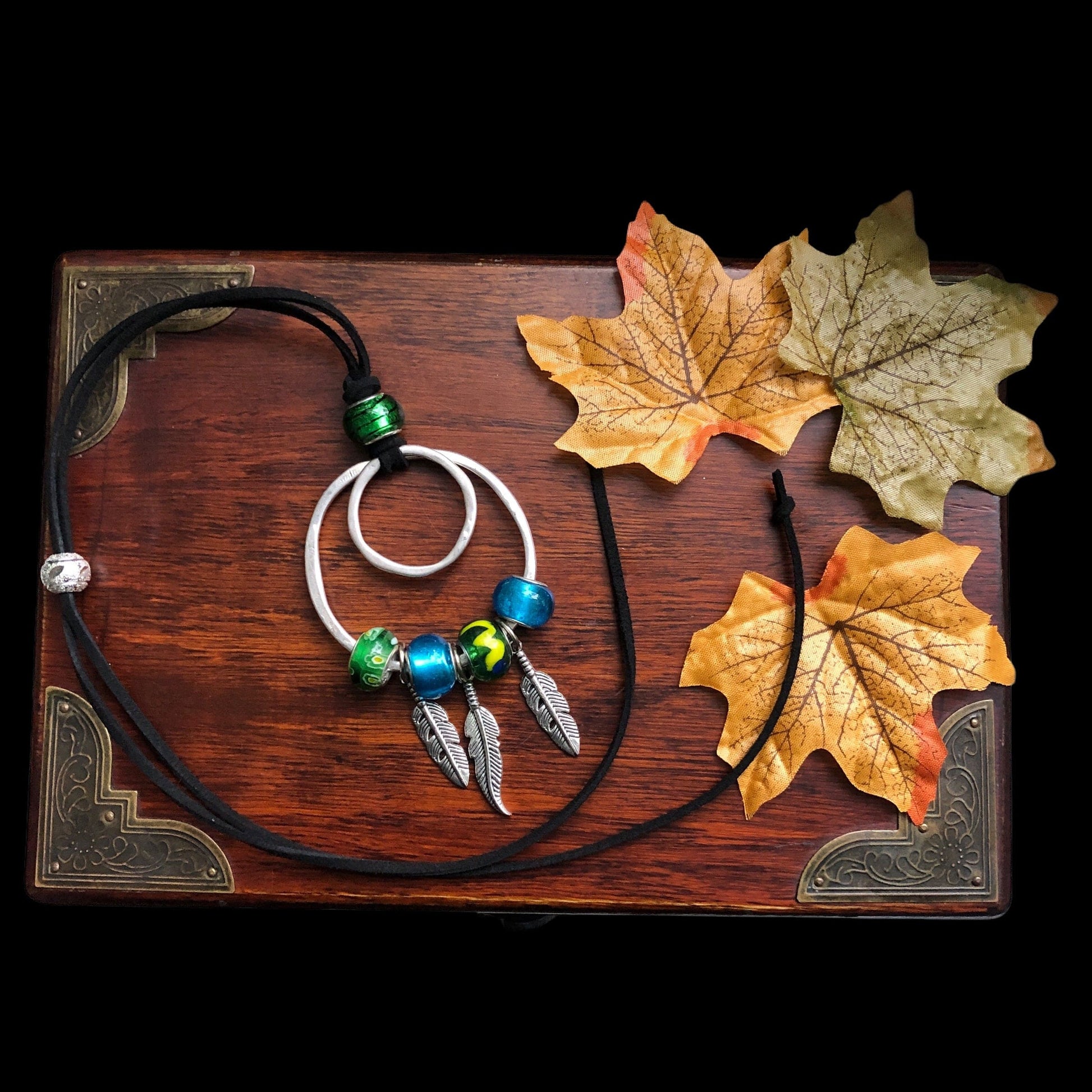 This handmade pendant necklace features stunning blue and green glass charms, along with pewter rings and metal feather accents. The Murano glass adds a touch of elegance to its unique design. The soft suede strap and silver metal bead make for a comfortable and stylish accessory. Elevate any outfit with this eye-catching Pendant Necklaces with Blue and Green Glass Charms.