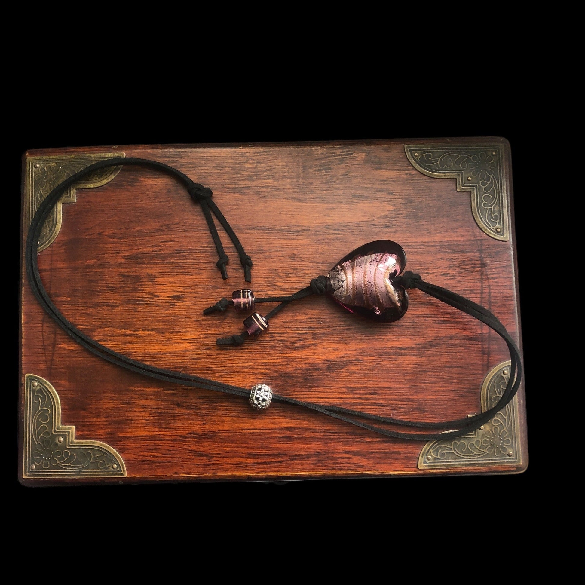 This handmade necklace features a stunning purple/burgundy glass heart pendant, accented with small cube glass beads and set on a sleek black suede strap. Add a touch of elegance and charm to any outfit with this unique piece. Perfect for any occasion, this Purple Glass Heart Pendant Necklace is sure to make a statement.